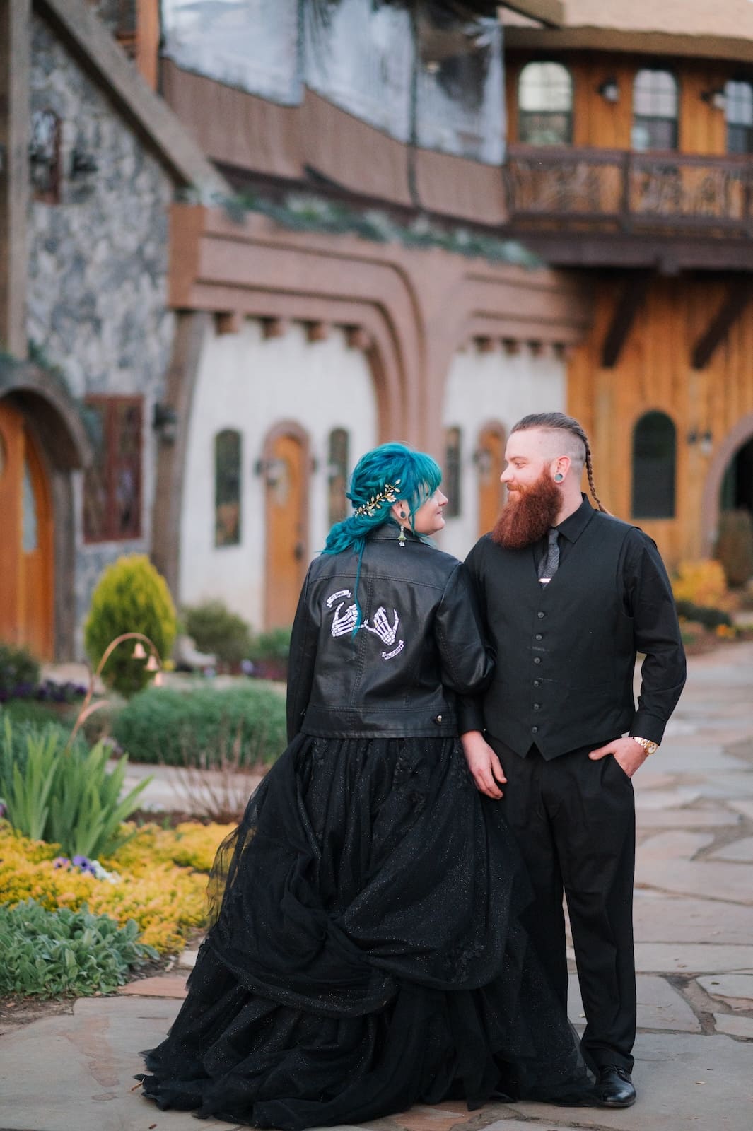 Sarah’s black gown rippled like starlight against the awakening forest, and her blue hair glowed with quiet radiance. Together, she and Teran created a moment of stunning contrast and beauty, a celebration of individuality that felt as timeless as the hills themselves.